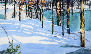 spring melt Micheal Zarowsky Fine Art Posted on March 21, 2026 by MichealMarch 23, 2026 winter pond bits of spring ice hardy lake 14″ x 24″ watercolour acrylic painted directly on gessoed panel / 980.
